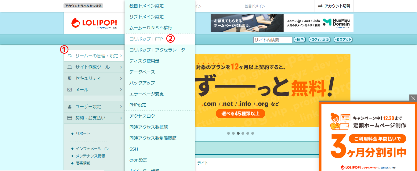 左のメニューの①「サーバーの管理・設定」から、②「ロリポップ!FTP」をクリックします。