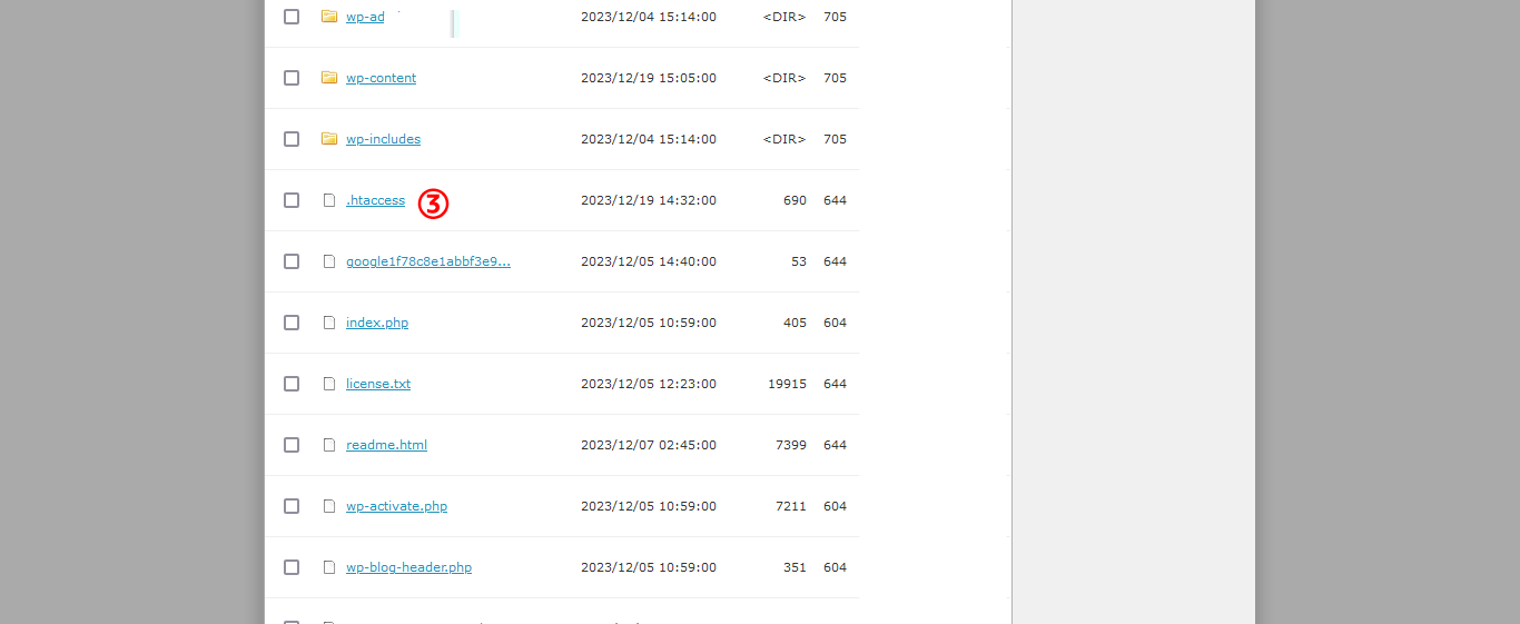 ③「.htaccess」ファイルをクリックして開きます。