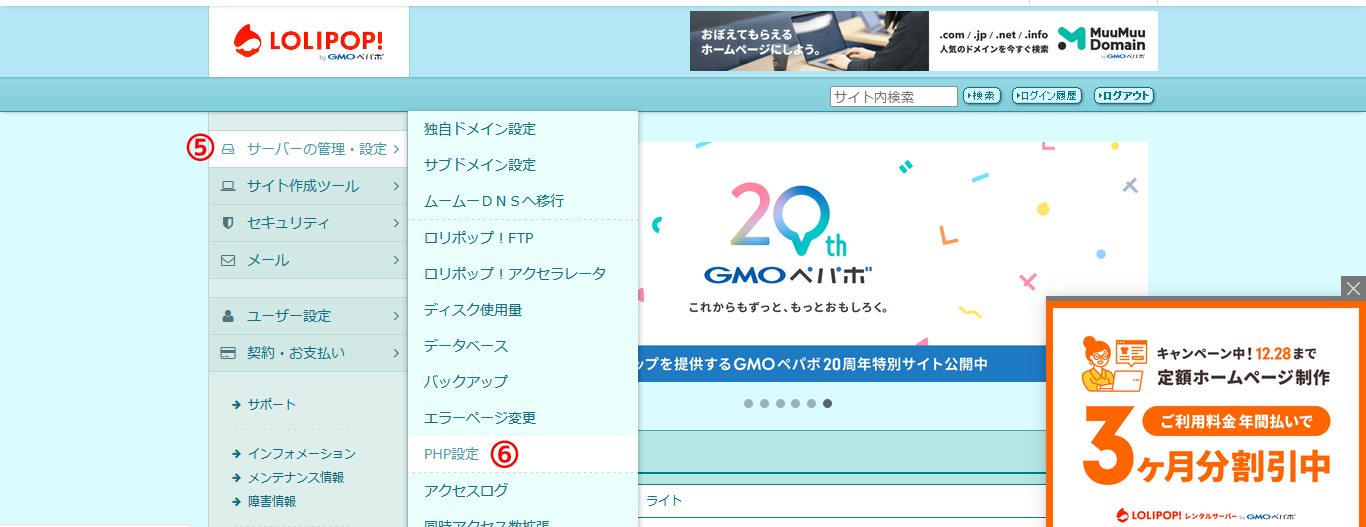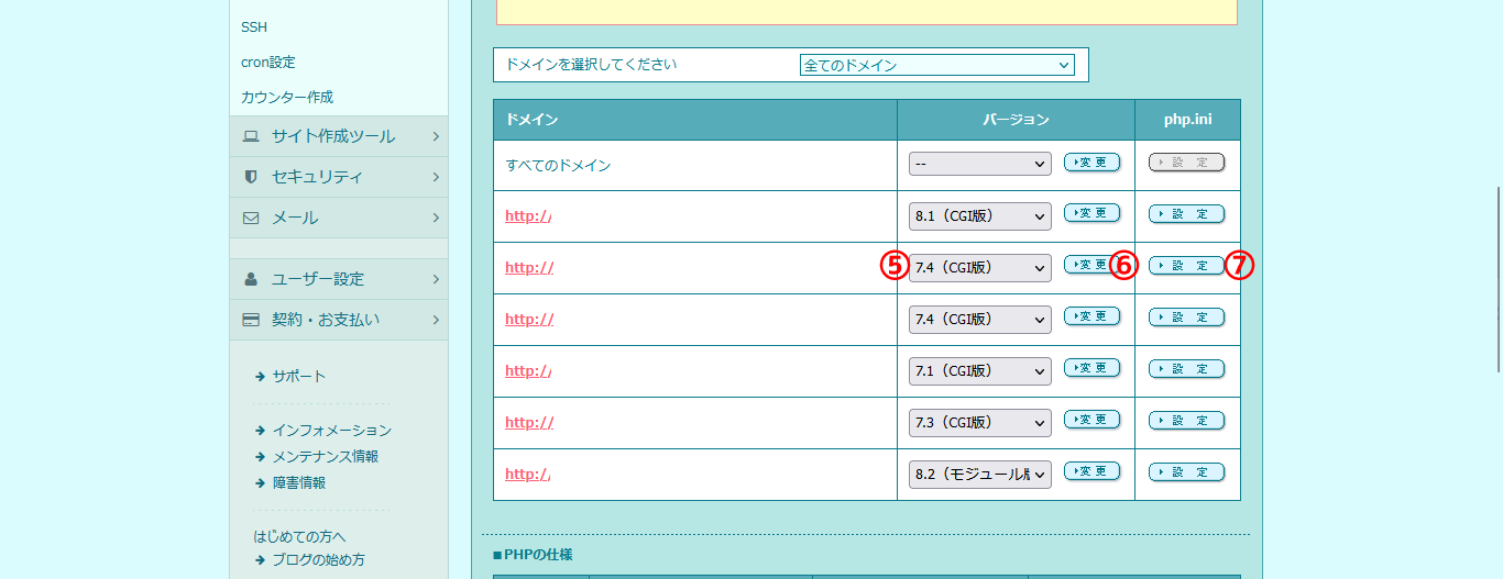 左メニューの⑤「サーバーの管理・設定」から、⑥「PHP設定」をクリックします。