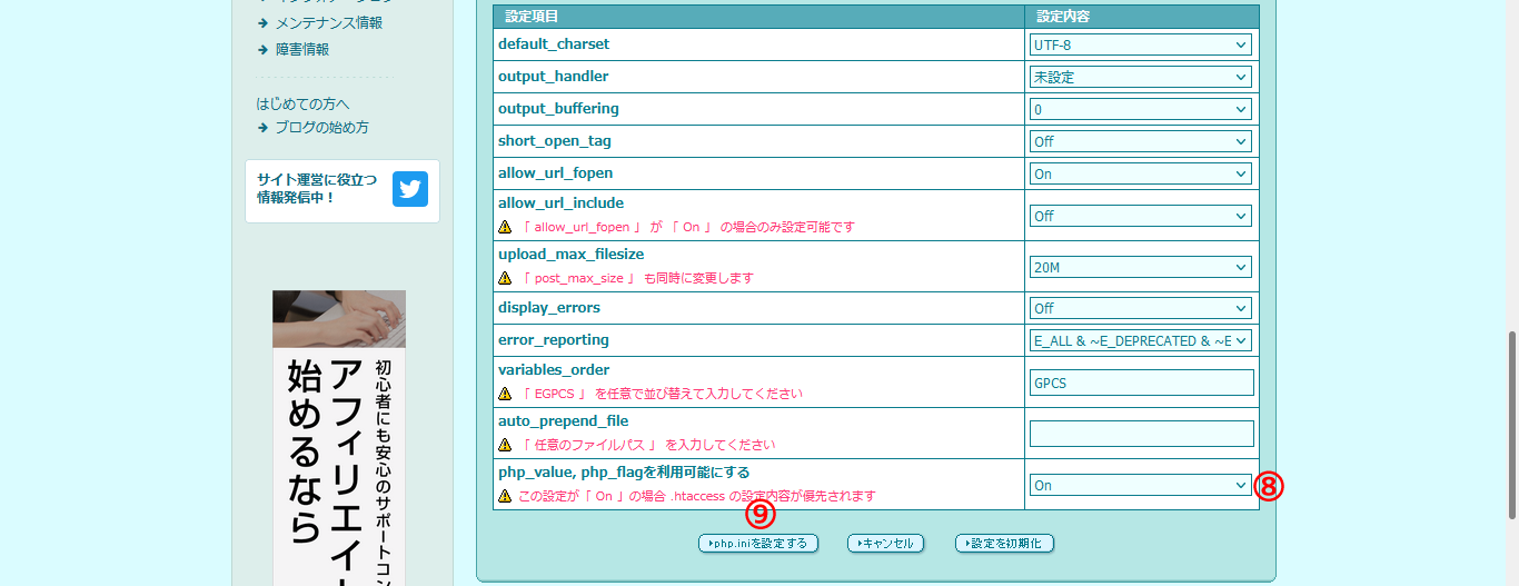 「php.iniの設定」ページを開いたら、いちばん下に「■そのほか」の項目の「php_value, php_flagを利用可能にする 」のところを⑧「On」に変更して、⑨「▶php.iniを設定する」をクリックする。